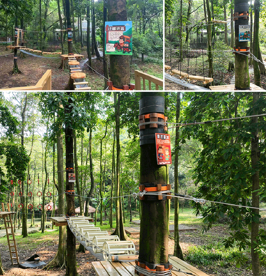 形态的融合:所有游乐设施的造型与色彩都力求低调自然。钢结构主体采用仿生设计或深色系涂装,使其在林中不易突兀;大量使用原生木材、绳网等自然材质,使攀爬网、吊桥等设施看起来如同山林自生的藤蔓与浮木。